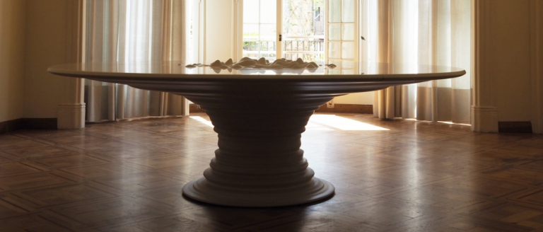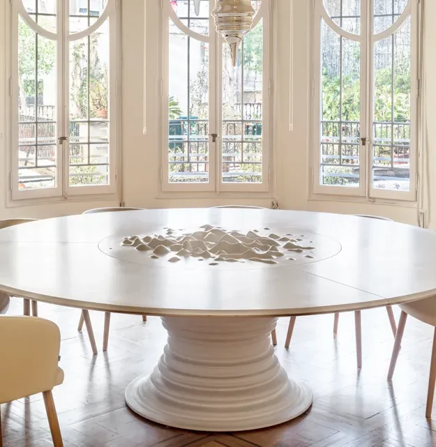 La Mesa Milky es una pieza de autor. Su diseño está firmado por External Reference, estudio de arquitectura dirigido por Carmelo Zapulla. Es una mesa de reuniones creada para una reconocida empresa catalana de la industria láctea ubicada en Casa Sayrach, Barcelona.