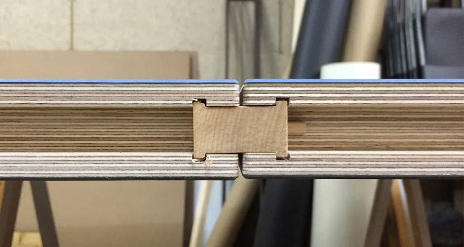 La propuesta consistió en generar un sistema de unión a modo de pieza «clave» que se inserta en una ranura continua lateral practicada en todo el perímetro de la mesa.