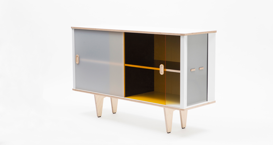 El aparador Ceibó es un mueble de almacenamiento que se compone como un collage de materiales y colores: madera, aluminio, plexiglas, Formica®. Blanco, rojo, gris, amarillo, negro. Brillo y mate. Todo combinado en una sola pieza.