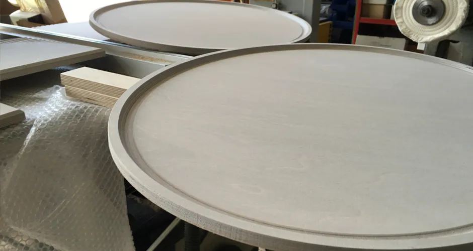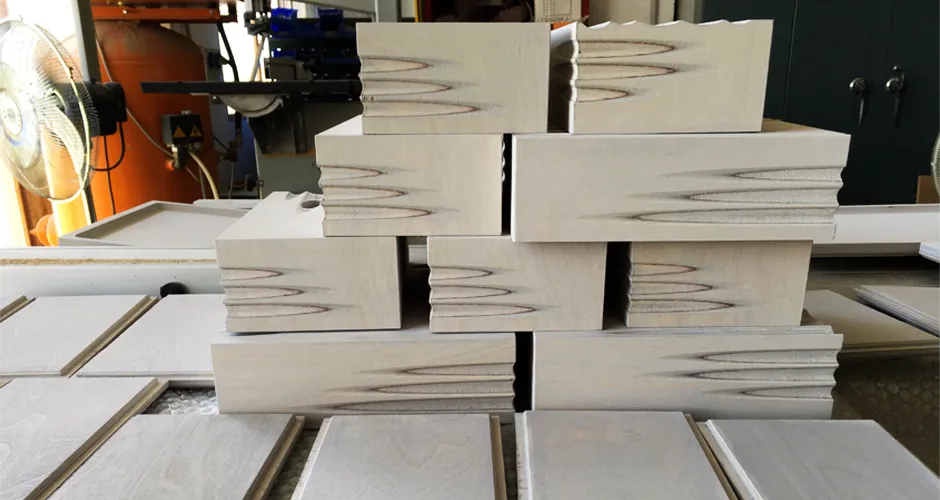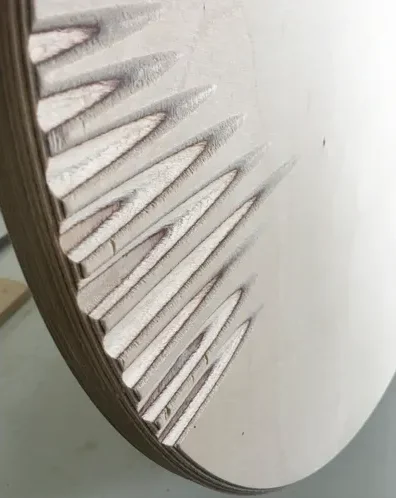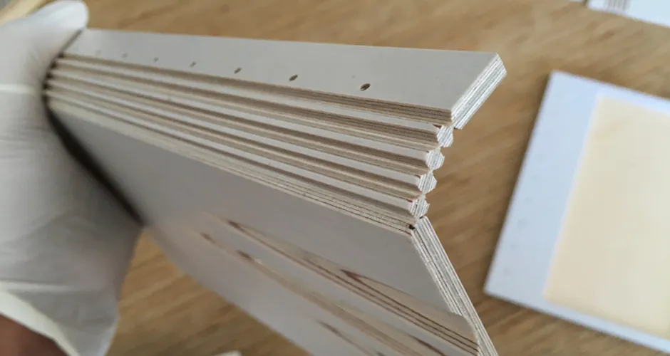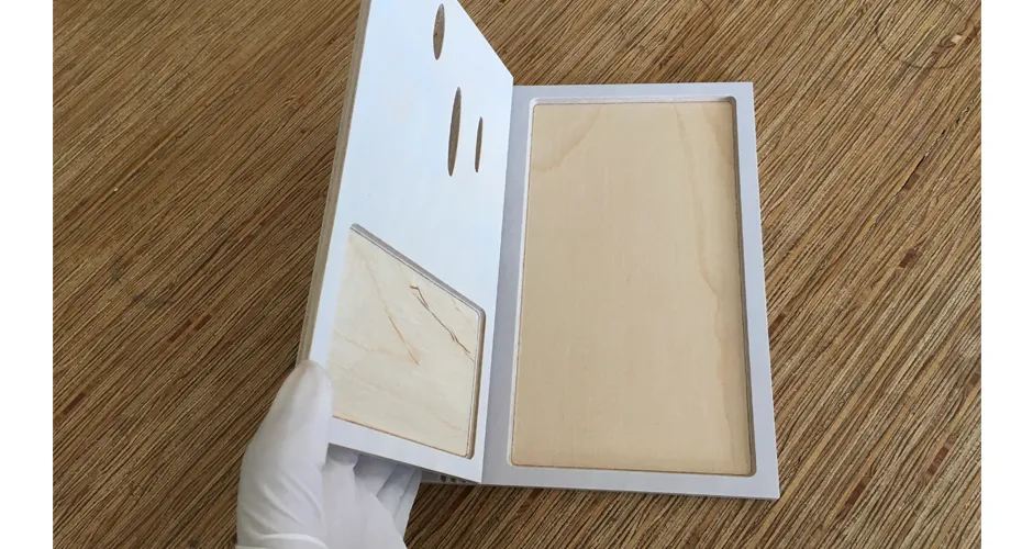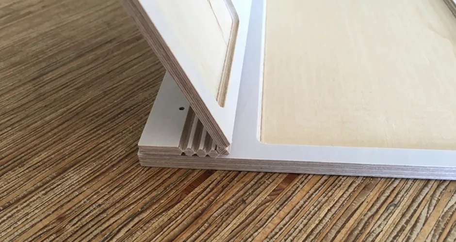 Todas las piezas están grabadas con ranuras que permiten ver las capas de madera de una manera sutil. El libro de pagos tiene una bisagra especial para ser flexible y permitir la apertura.