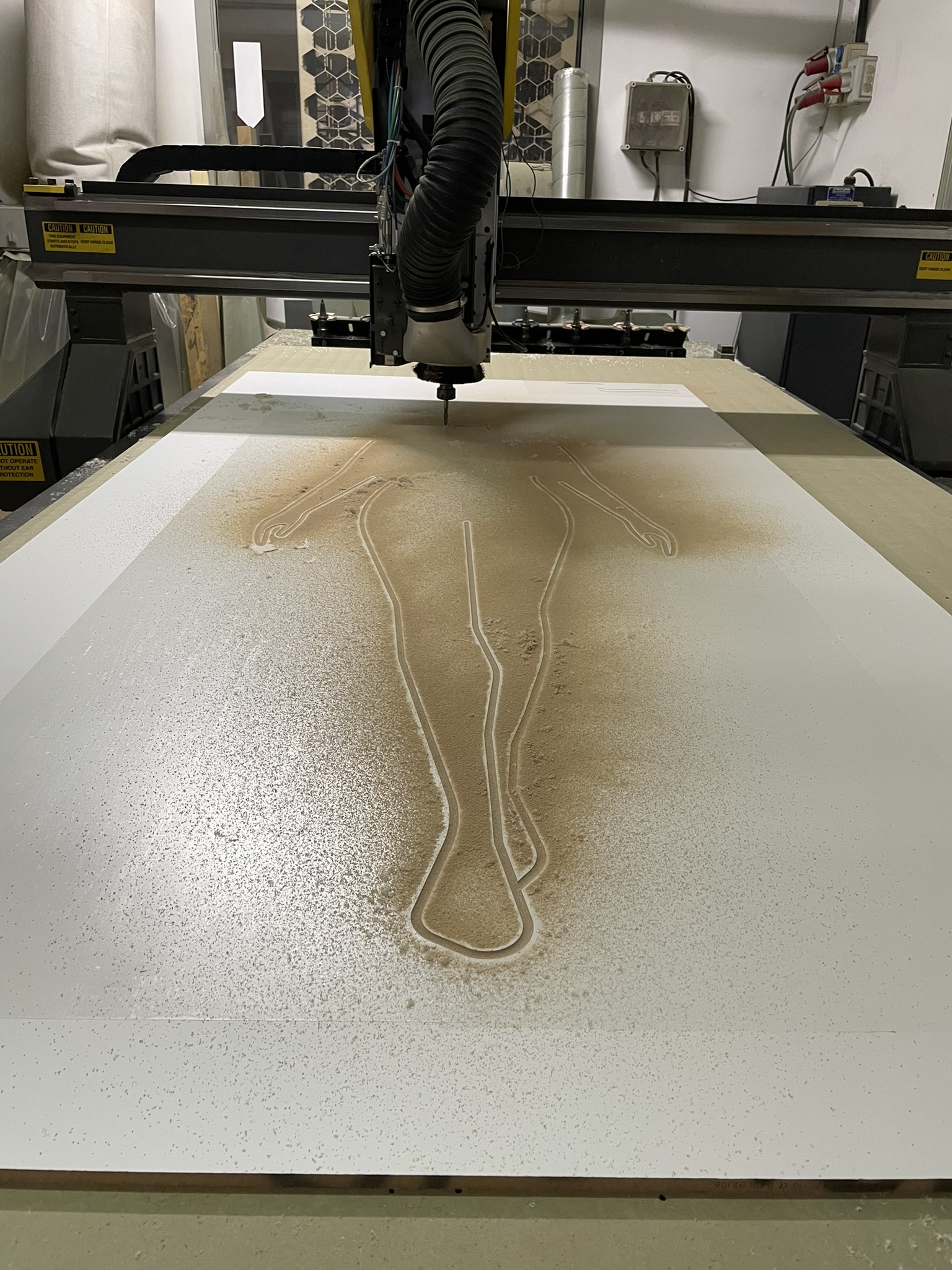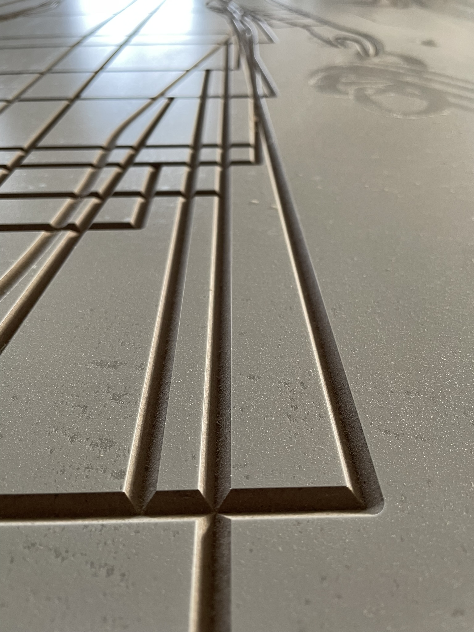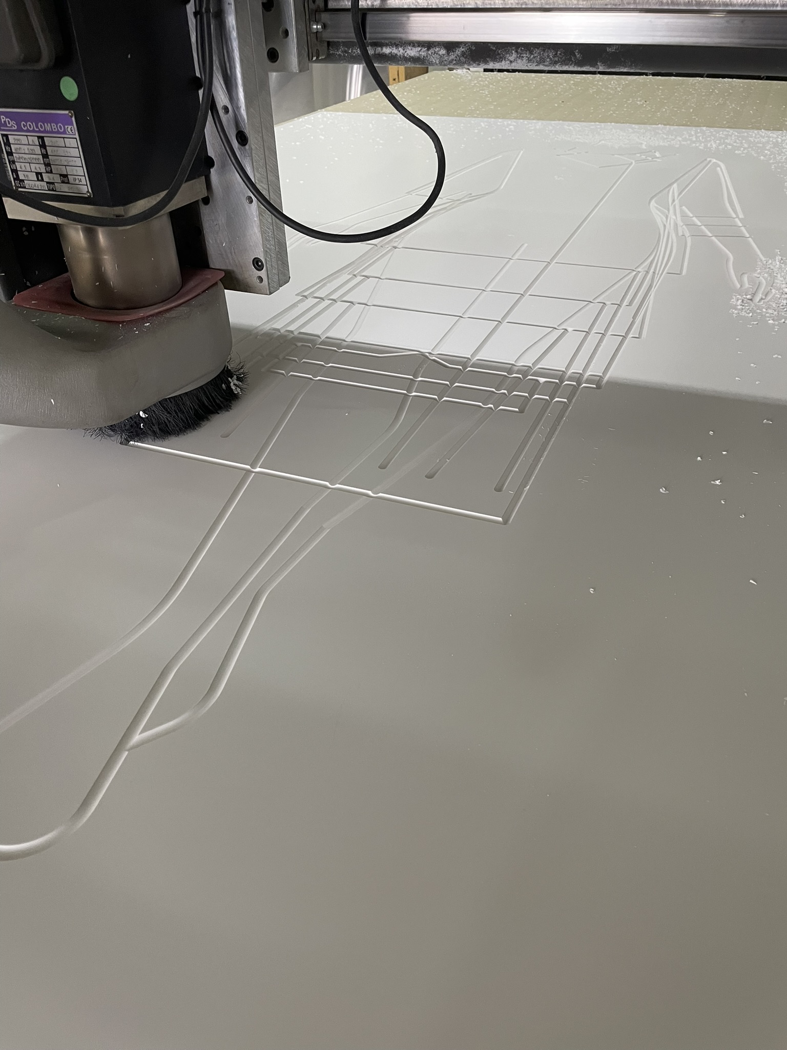 El desafío principal radicaba en crear una superficie que no solo recibiera la luz, sino que la potenciara, a la vez de que se lograra la sincronía perfecta entre proyección y soporte. Fabricamos dos paneles de gran formato fresados en Corian®, cuyas geometrías fueron calculadas minuciosamente para interactuar con los contenidos visuales de Onion Lab.
