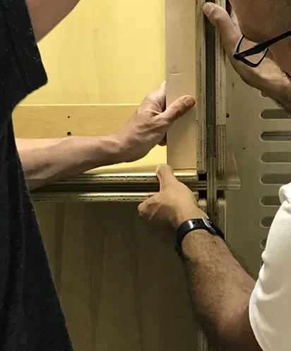 La solución constructiva que propusimos consiste en un sistema de madera compuesto por paneles con ranuras perimetrales en los que se insertan elementos de unión en forma de cruz. Estos elementos de conexión facilitan los ensamblajes en distintas direcciones.