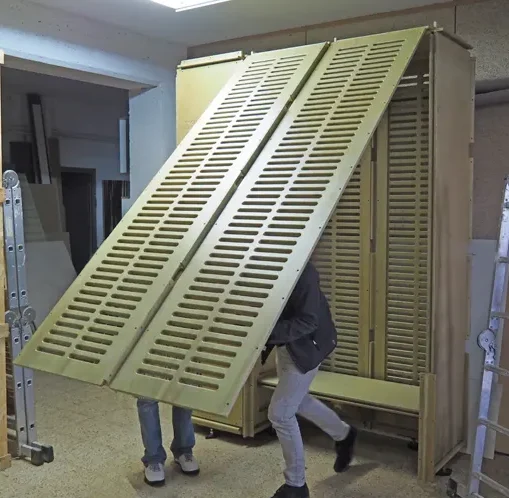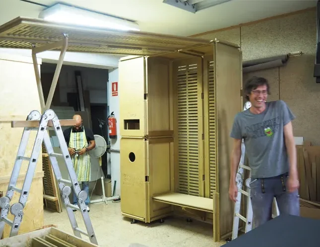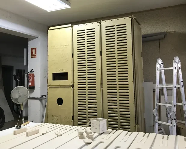 Propusimos el montaje en seco con espigas de madera sin la ayuda de tornillos para agilizar la tarea. La madera escogida es tablero de chopo nacional tratado en autoclave por su alta durabilidad y resistencia a la intemperie. Sostenible, ligero y local.