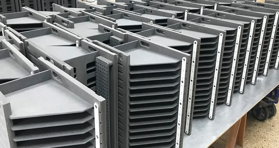 Los racks que diseñamos para Histovery son remontables para adaptarse al mobiliario existente. Cada rack tiene la capacidad de almacenar hasta 15 tablets, asegurando un acceso fácil y eficiente.